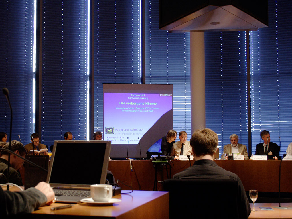 Auf Einladung der Bundestagsfraktion Bündnis90/Die Grünen fand am 20. April im Bundestag unter dem Titel "Die Schattenseite des Lichts" ein Fachgespräch zum Thema Lichtverschmutzung statt. Organisiert wurde das Gespräch vom Bundestagsabgeordneten Peter Hettlich und seinem Büro und es gab folgende Hauptreferate: