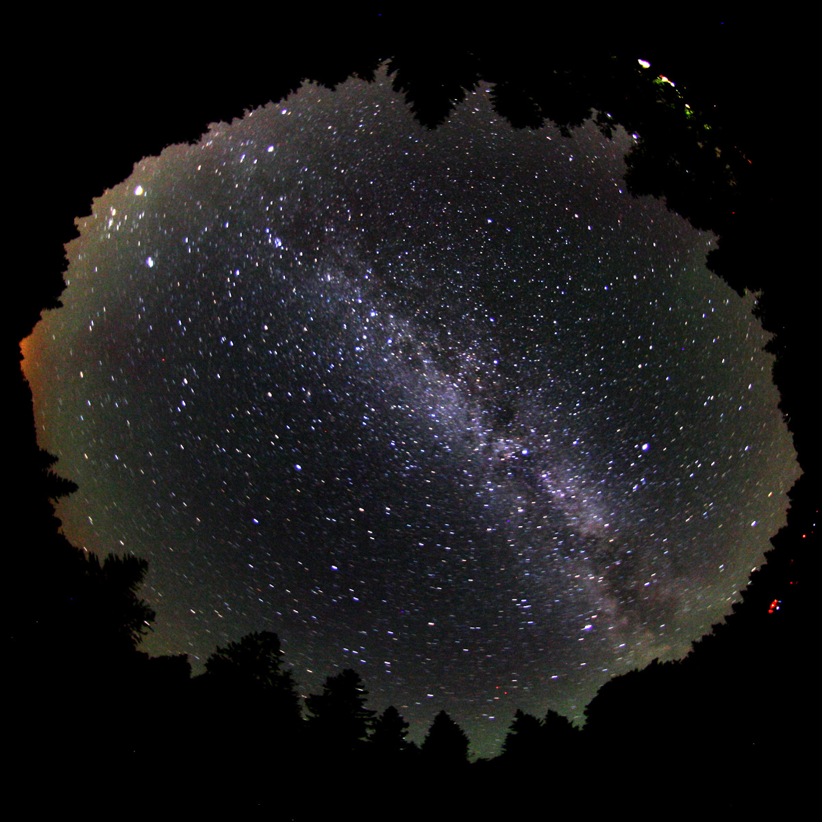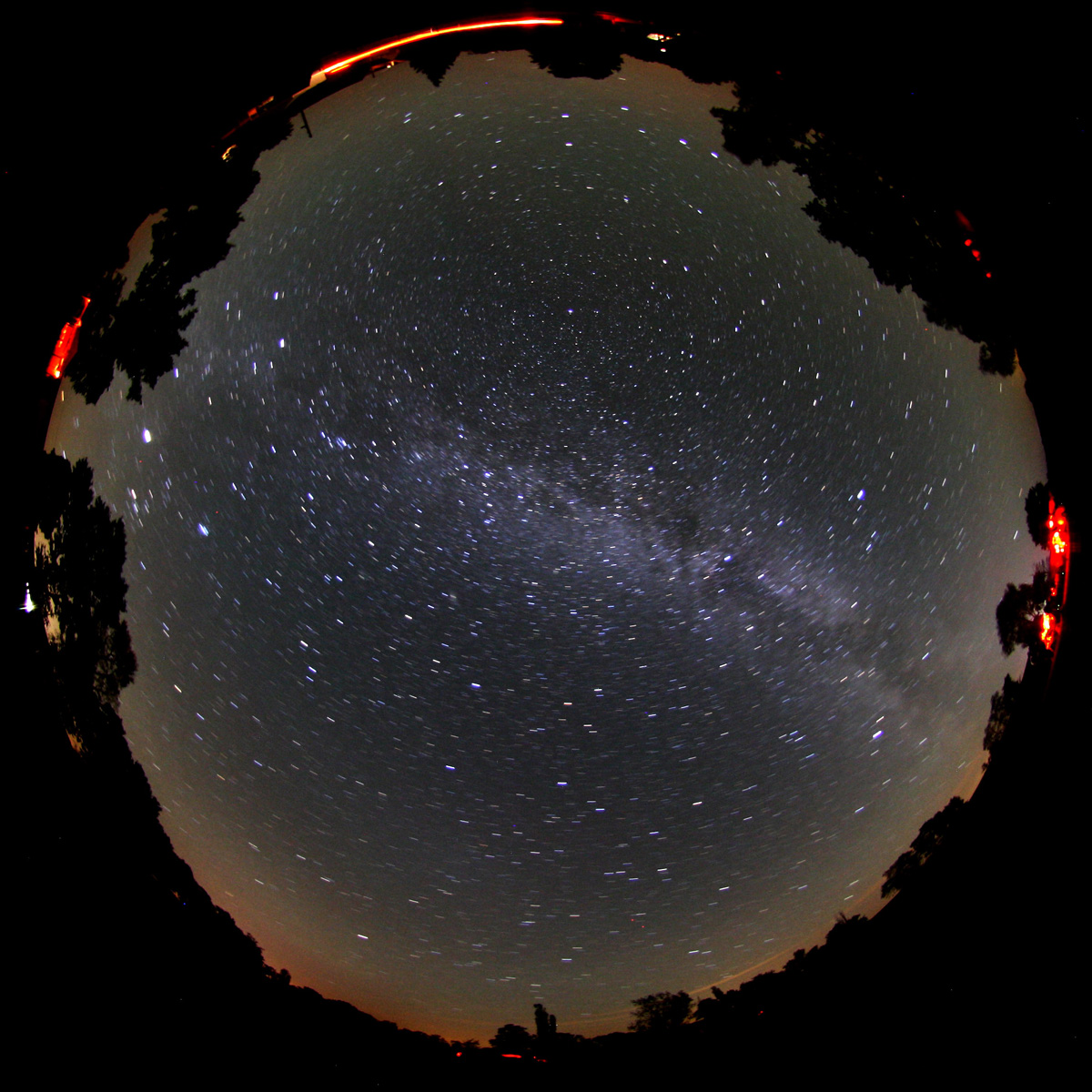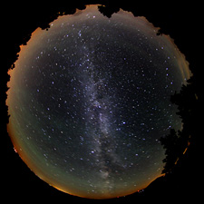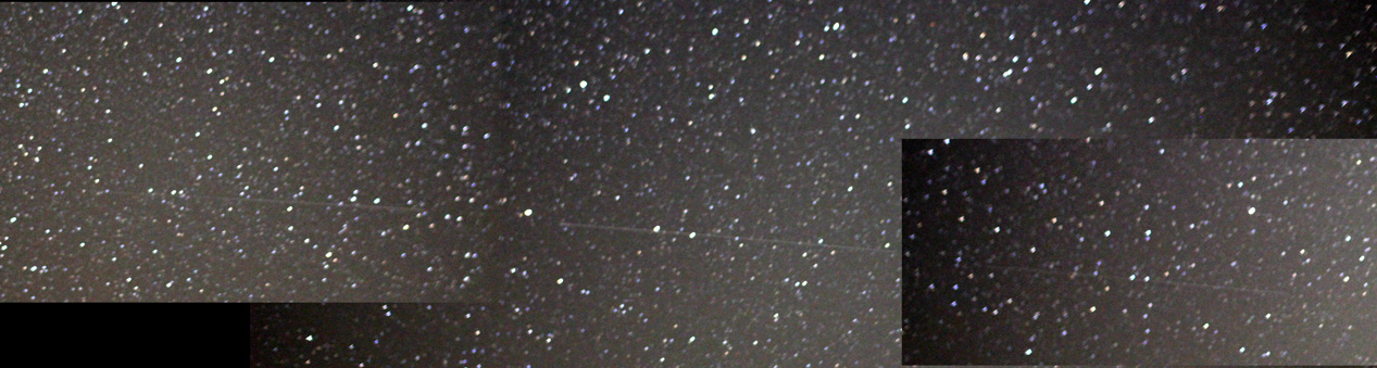 STATT Teleskoptreffen Sankt AndreasbergBeim 3. STATT war vor allem die Nacht vom 18. zum 19.8. sehr klar. Der Himmel wurde allerdings nicht viel dunkler als 21.25 mag/arcsec2 und tatsächlich war auf den Aufnahmen vor allem nach Mitternacht wieder Airglow-Aktivität zu beobachten. DMSP-Satellit beobachtetAm nächsten Abend gelang es einen DMSP-Satelliten (die liefern die Daten für die Lichtverschmutzungskarten) zu fotografieren, mit bloßem Auge war er nicht zu sehen, da zu schwach. Die Vorhersagen wurden mit Hevaens-above.com erstellt. Drei aufeinander folgende Aufnahmen, je 30 Sekunden belichtet, zeigen die schwache Spur des Satelliten und wurden zusammengefügt.