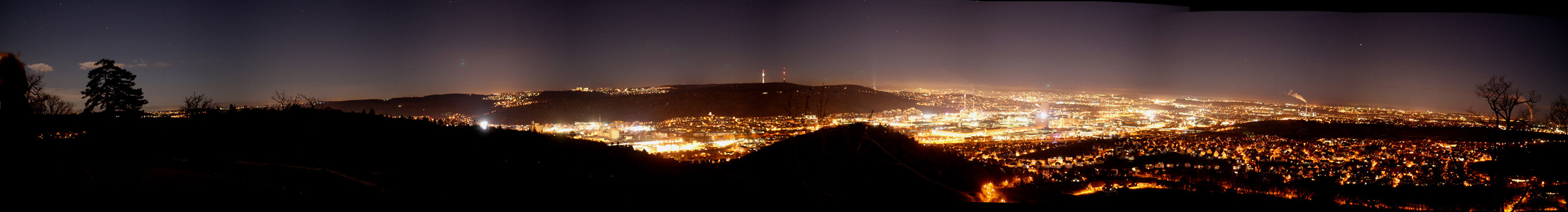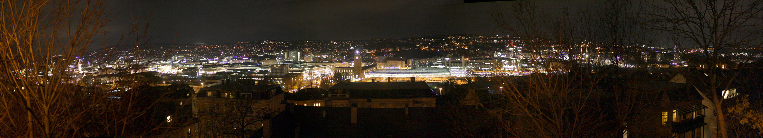 Bild links: Obwohl das Gesetz, dass Bürobeleuchtungen nach Geschäftsschluss abgeschaltet werden müssen, noch nicht in Kraft ist, sind viele Bürogebäude in den Abendstunden bereits dunkel. Dieses Hochhaus wird zudem von oben nach unten angestrahlt. Lichterstreit in HannoverDie bekannte deutsche Boulevardzeitung berichtete über den "Verdunklungsplan" für Hannover, doch die rot-grüne Ratsfraktion hatte Maßnahmen gegen die Lichtverschmutzung gefordert. Im kommunalpolitischen Streit wettern dann natürlich CDU, FDP und City-Gemeinschaft dagegen. Eine sachliche Diskussion gibt es nicht und es werden immer die gleichen Scheinargumente gegen die Reduzierung der Lichtverschwendung vorgebracht (› Artikel). Fakt ist beispielsweise: Nach Reduzierung oder gar Abschalten der Beleuchtung ist es in englischen Städten und auf französischen Autobahnen sicherer geworden. Und in Paris erkennt man inzwischen auch die negativen Auswirkungen von zu viel Licht und ergreift Maßnahmen zur Reduzierung. November 2012StuttgartAm 30. November konnten mit Matthias Engel vom Projekt Sternenpark Schwäbische Alb Nachtaufnahmen in Stuttgart gemacht: