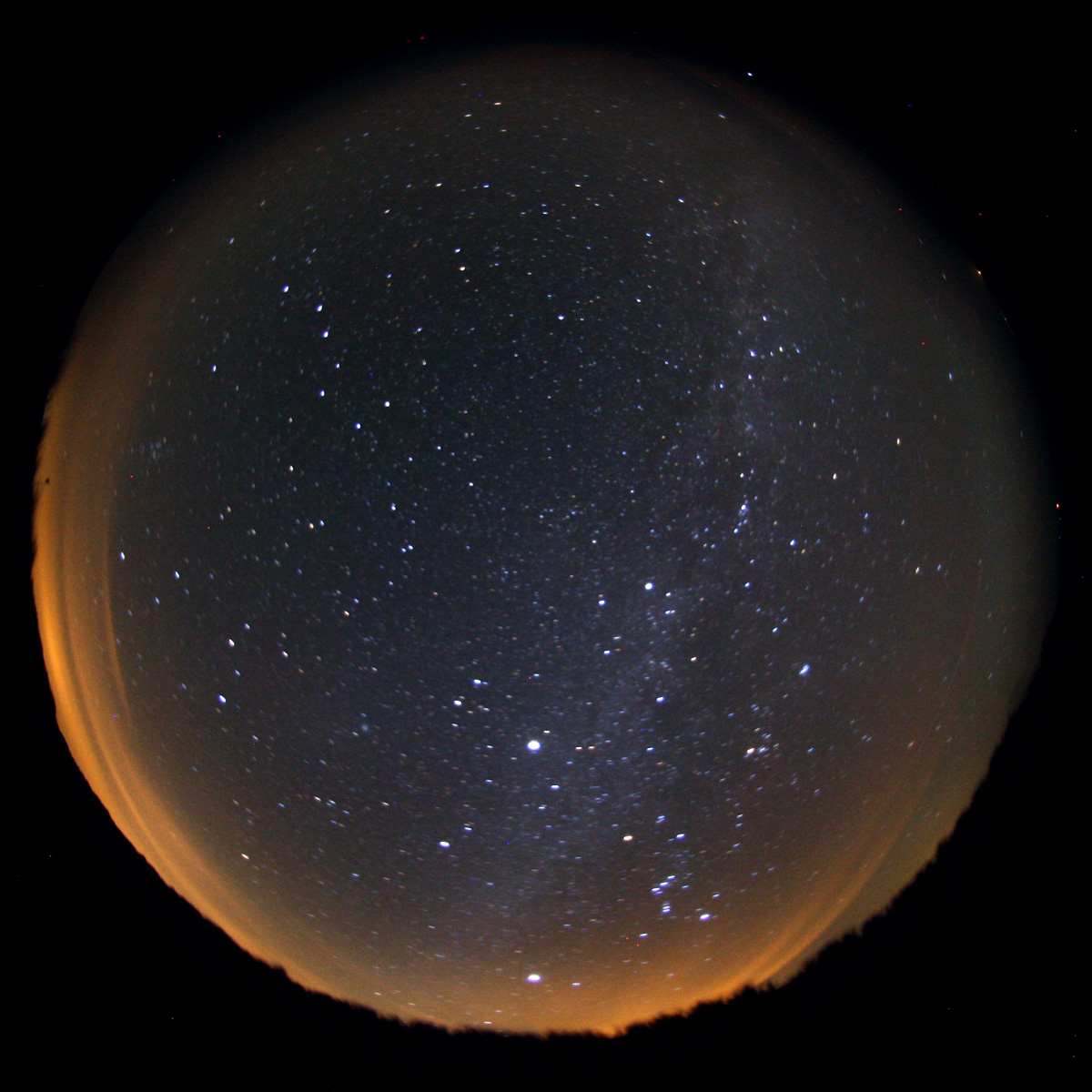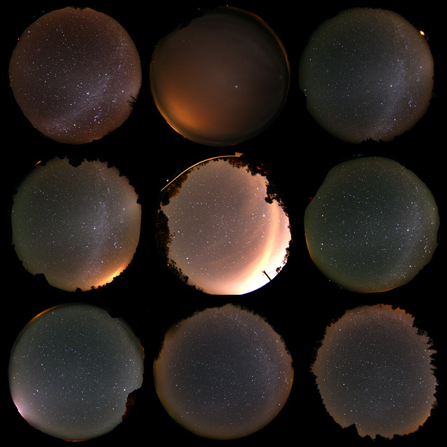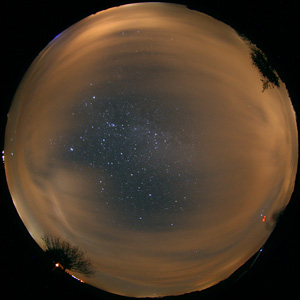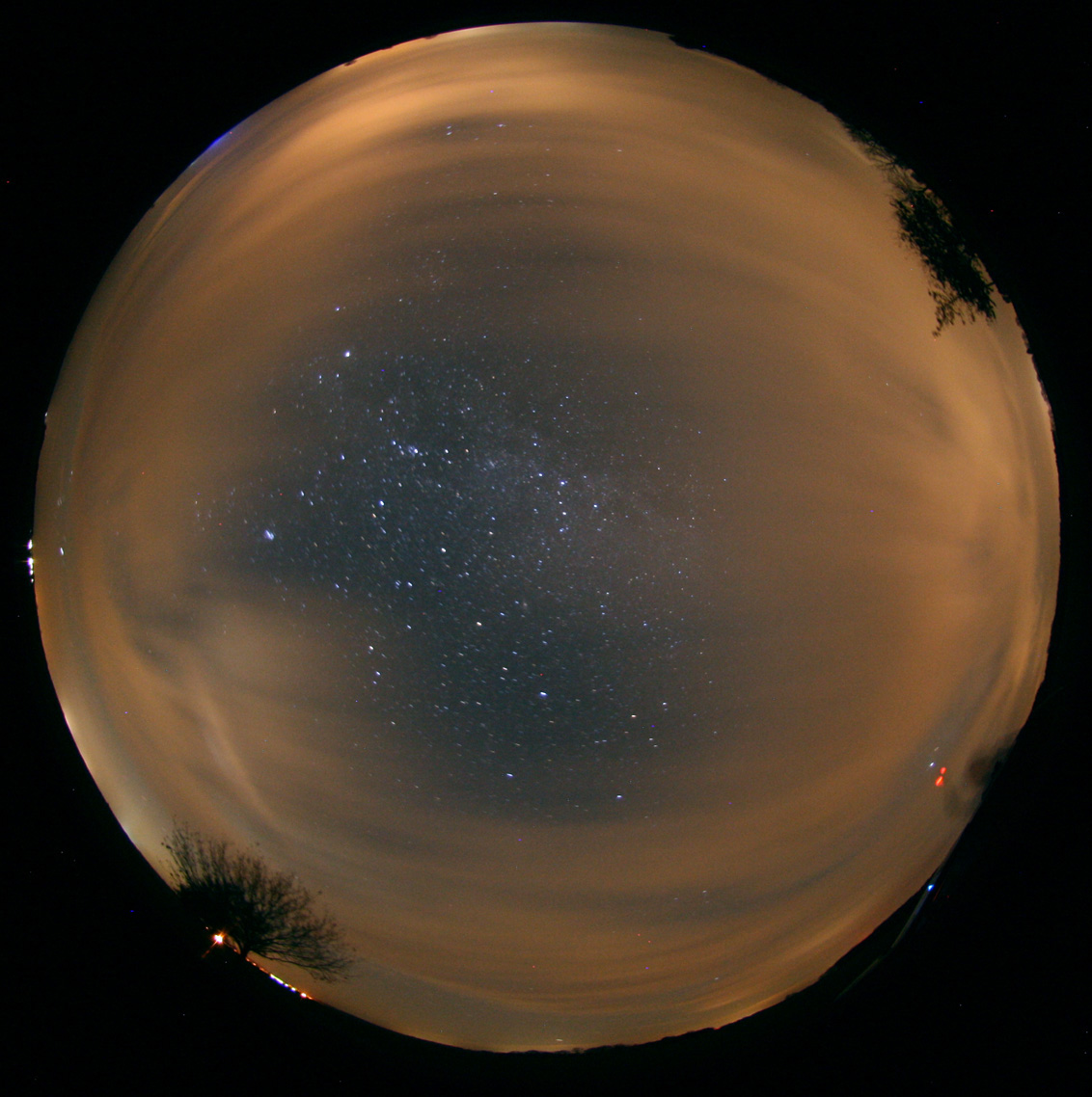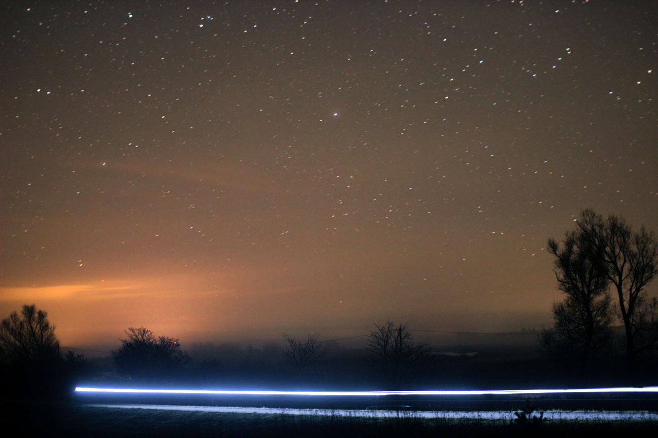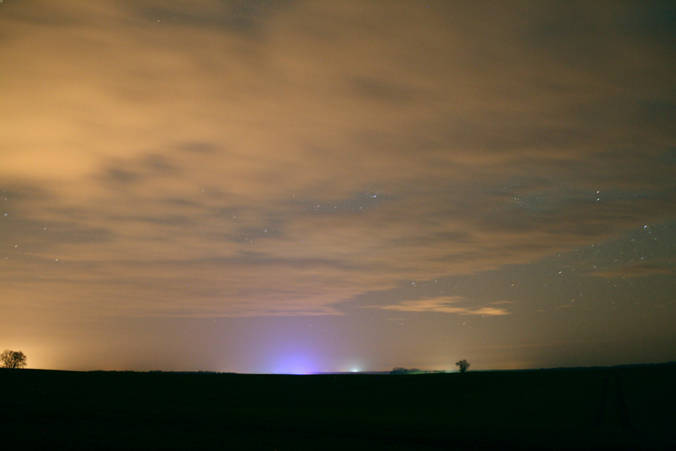Nach einem wunderschönen Nachmittag wurde für den Abend des 24.11. eine klare Nacht erwartet, doch nach dem Verlassen der Stadt Waren zeigte sich der Himmel nördlich von Groß Kelle (53.420288°, 12.539545°) stark bewölkt. Es wurden in Wolkenlöchern eine Helligkeit von 21.25 mag/arcsec2 gemessen, der Himmel erschien durch gestreutes Licht stark aufgehellt. Am nordöstlichen Himmel fällt eine deutlich blaue Aufhellung auf.