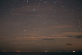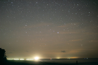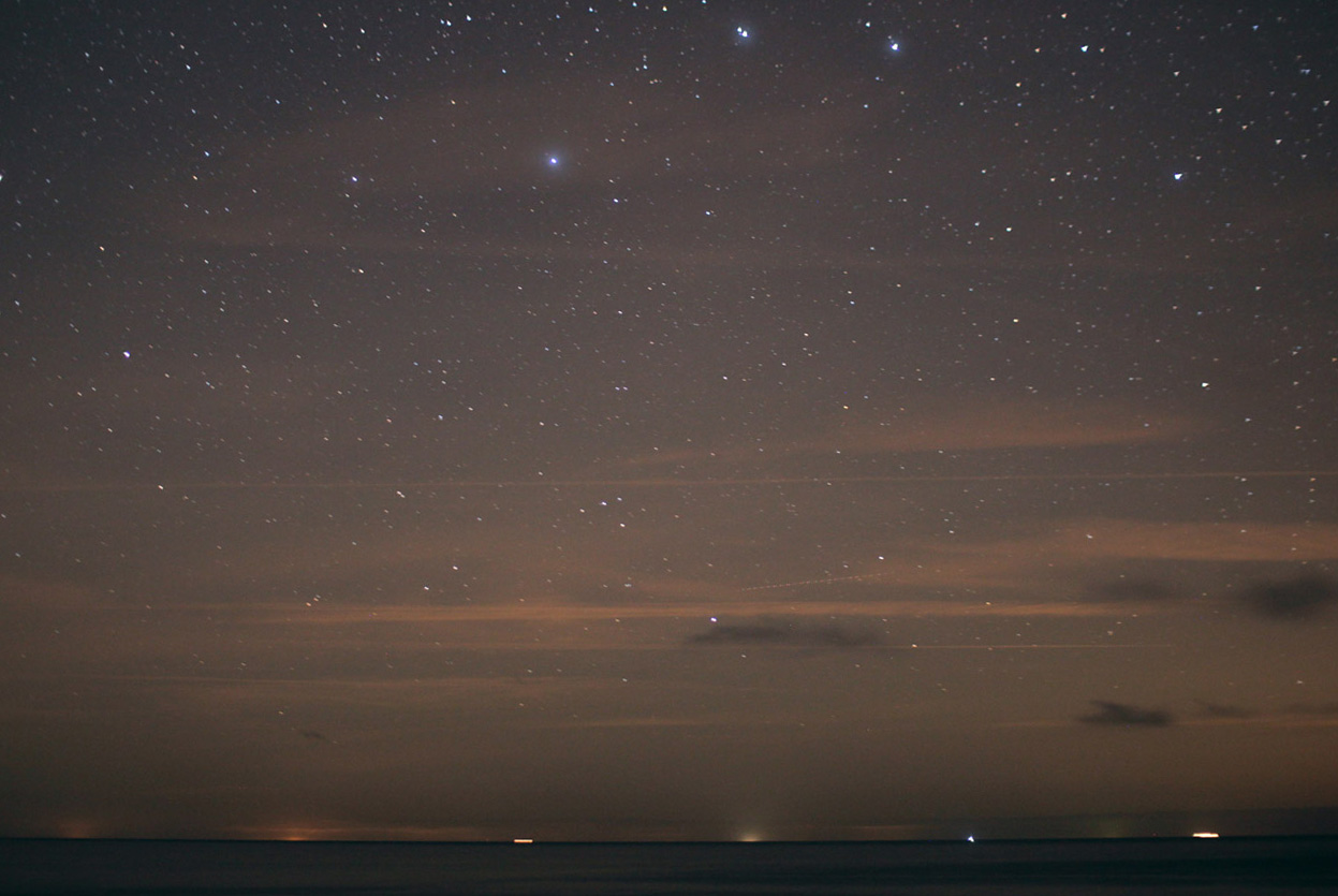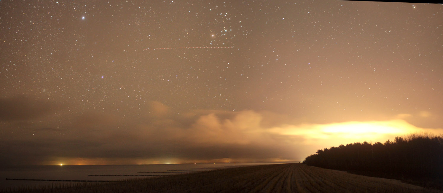 In Richtung Zingst ist viel indirektes Lichtan den beleuchteten Wolken zu sehen, einzelne ferne Lichtquellen von Hiddensee und Rügen. Auffällig ist, dass die Wolken über der See dunkel sind. |