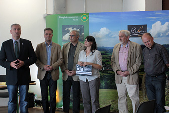 Am Morgen übergab in der Staatskanzlei Brandenburg in Potsdam Christopher Kyba vom Vorstand der IDA die Urkunde unter den Augen der brandenburgischen Umweltministerin Anita Tack an die Naturparkleiterin Kordula Isermann, rechts daneben Jens Aasmann, der Amtsdirektor des Amtes Rhinow, in dem die Kernzone des Sternenparks liegt.