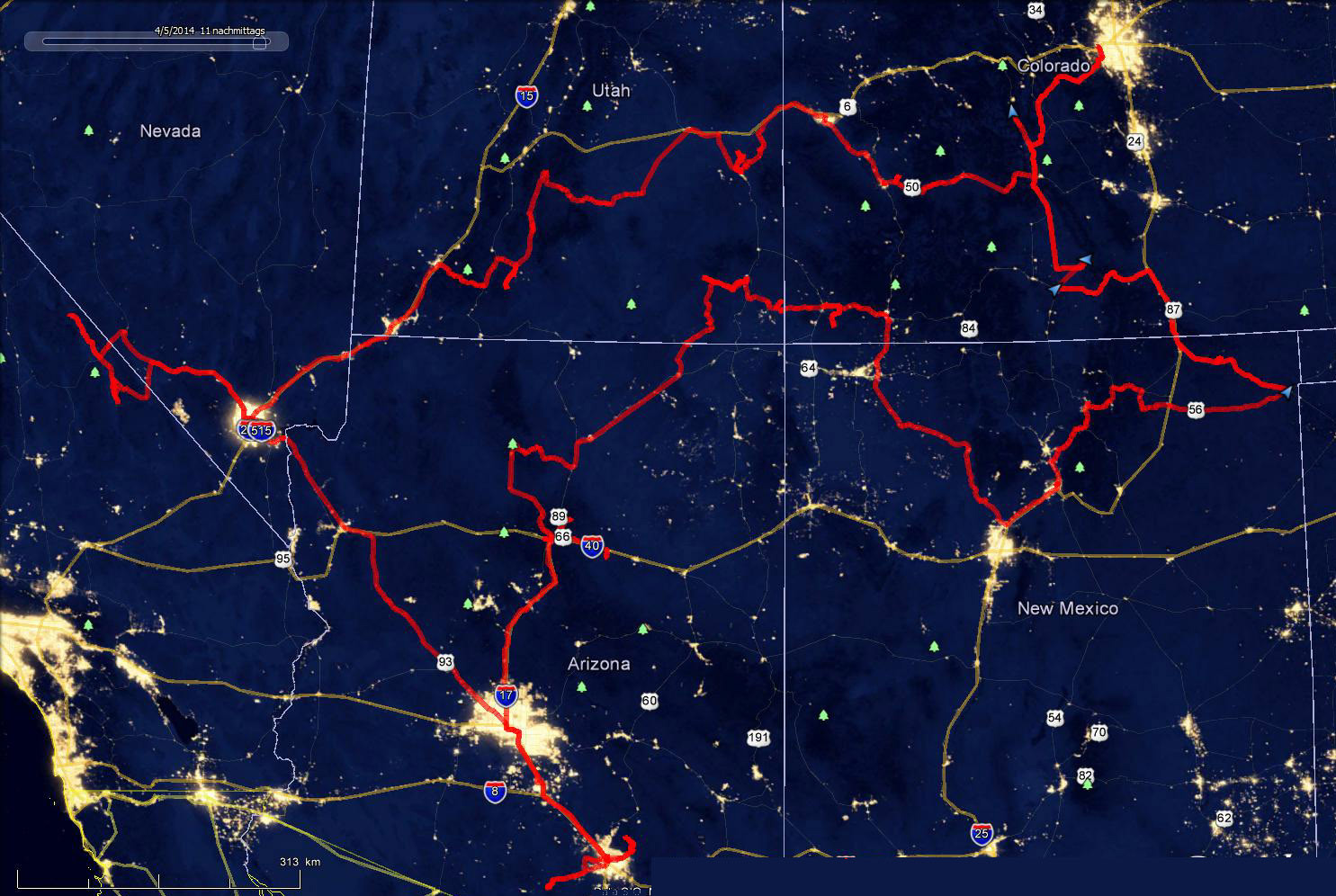 Die Reiseroute, aufgezeichnet mit einem GPS und einer VIIRS-Karte mit den Nachtlichtern überlagert. |