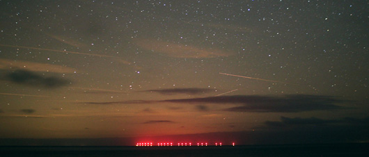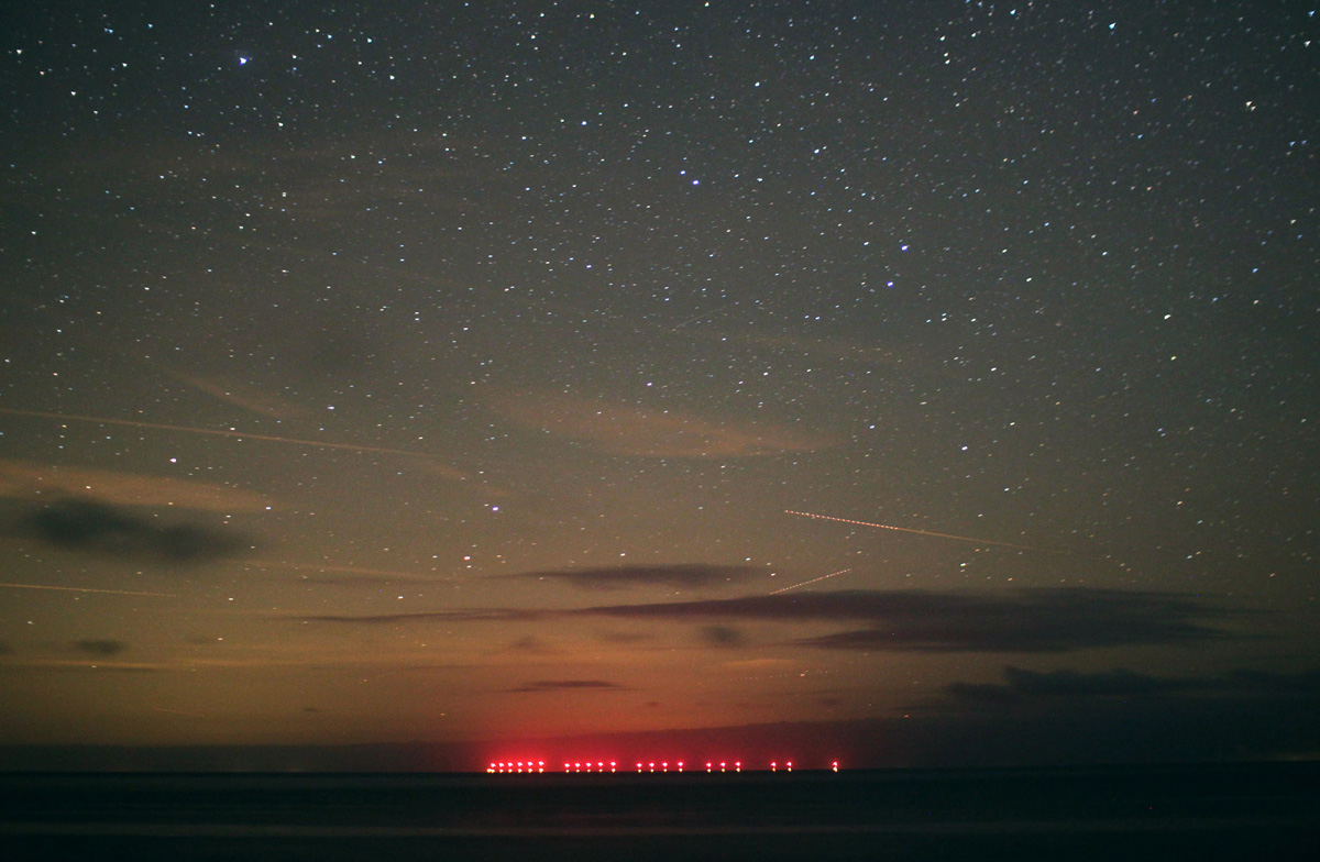 Die blinkenden roten und tieferen gelben Lichter des Offshore-Windparks Baltic1 in 16 km Entfernung fallen sofort auf, ihr Einfluss wird auf der Aufnahme erkennbar. Damit wird die vormals dunkle See durch zusätzliche stationäre Lichter aufgehellt. |