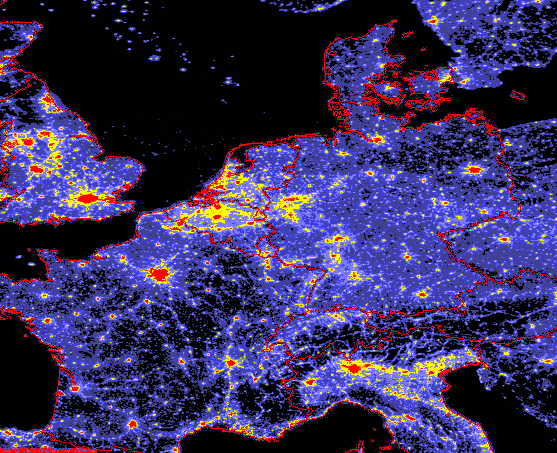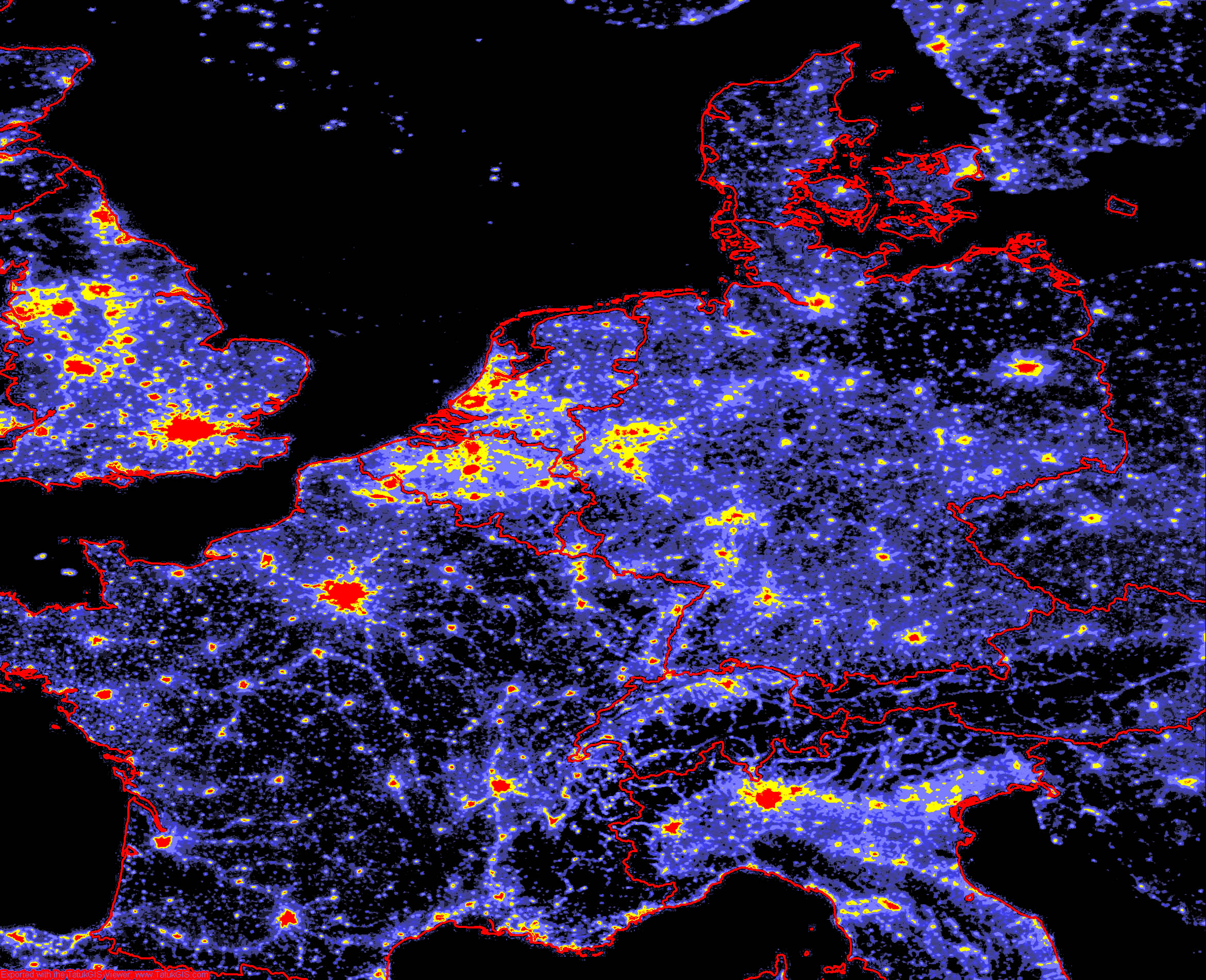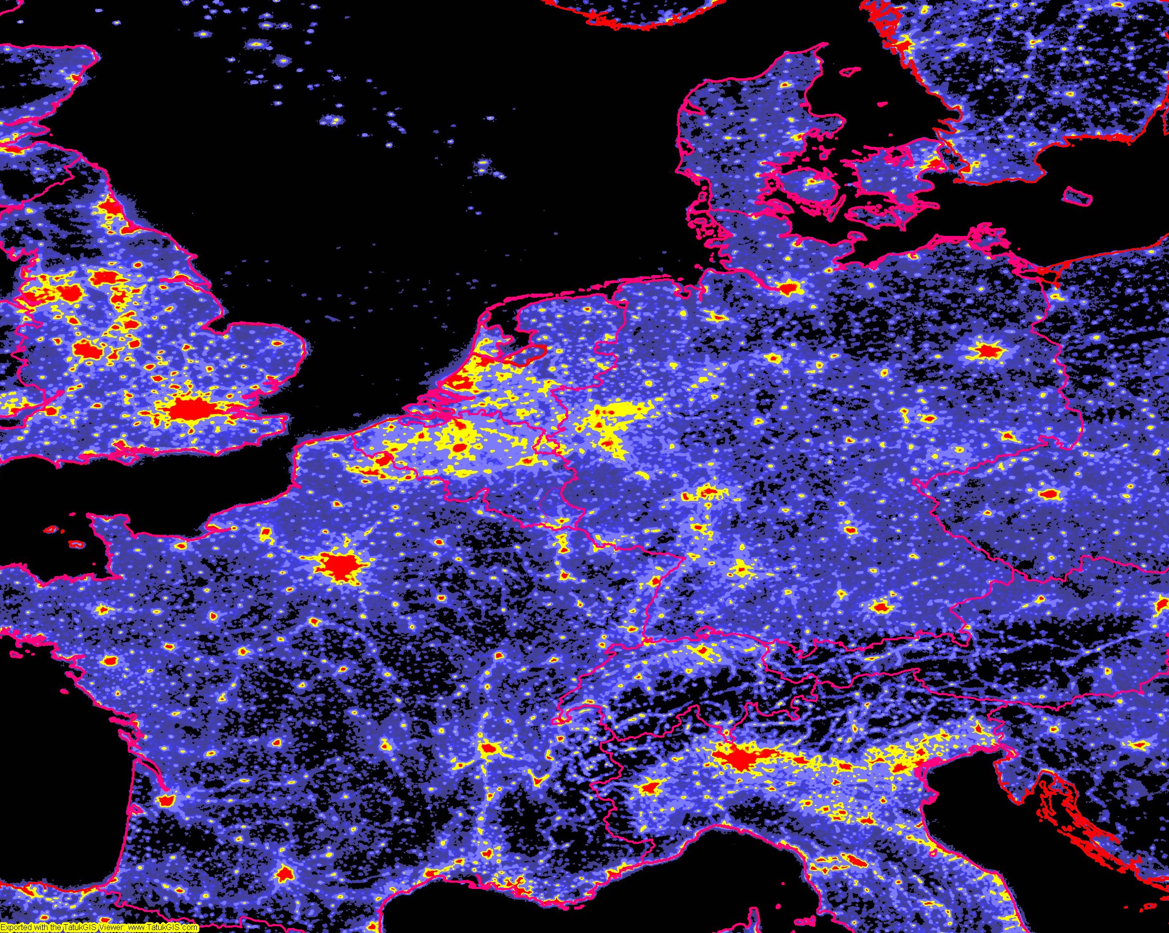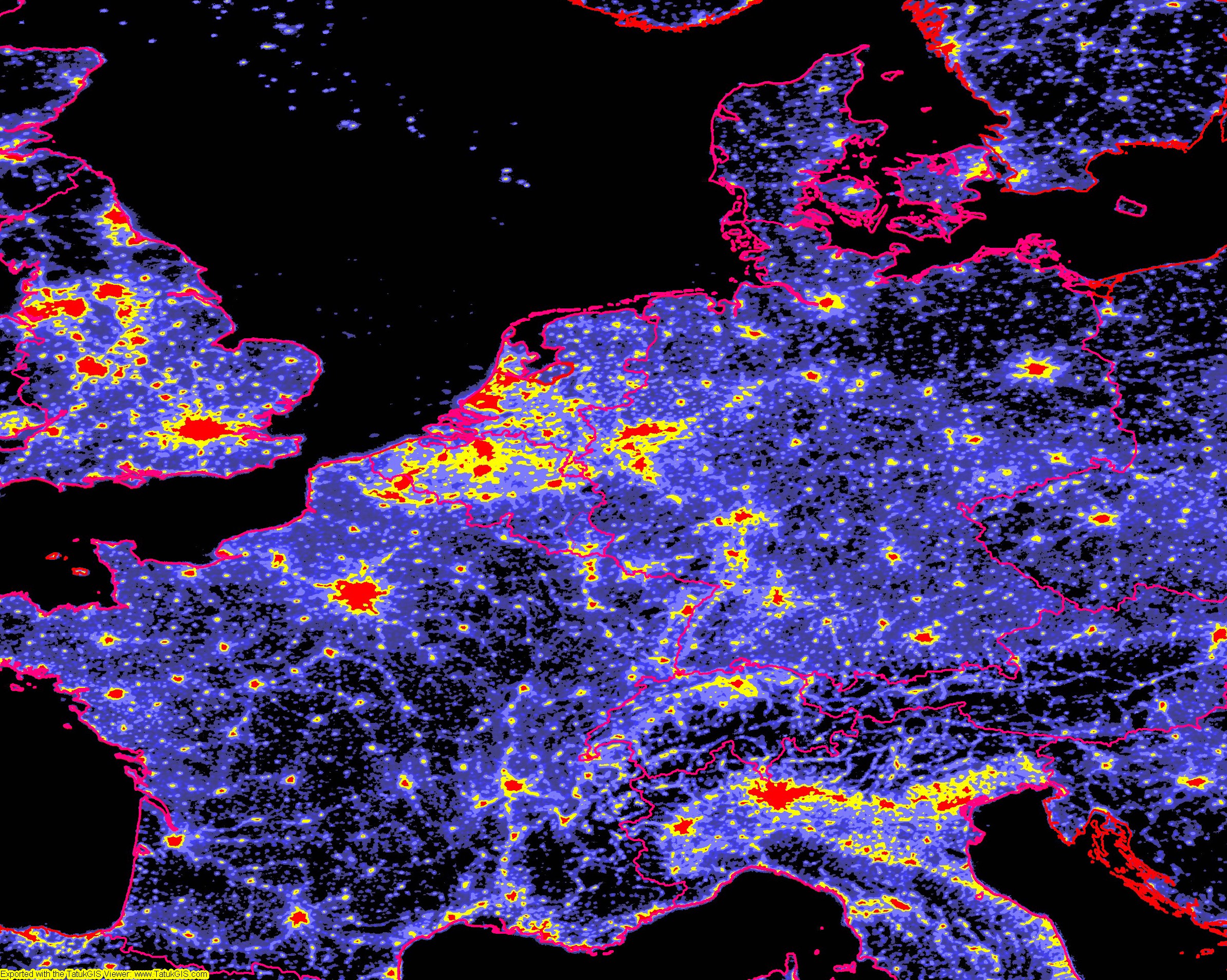 Die Karte von Frederic Tapissier hat zwar eine hohe Auflösung, sie ist aber eigentlich nur ein Abbild der Bevölkerungsdichte. Sie beruht nur auf Kartendaten von Städten und Gewerbegebieten, denen er bestimmte Helligkeiten zugeordnet hat, die er mit Höhendaten kombiniert und verschmiert hat.