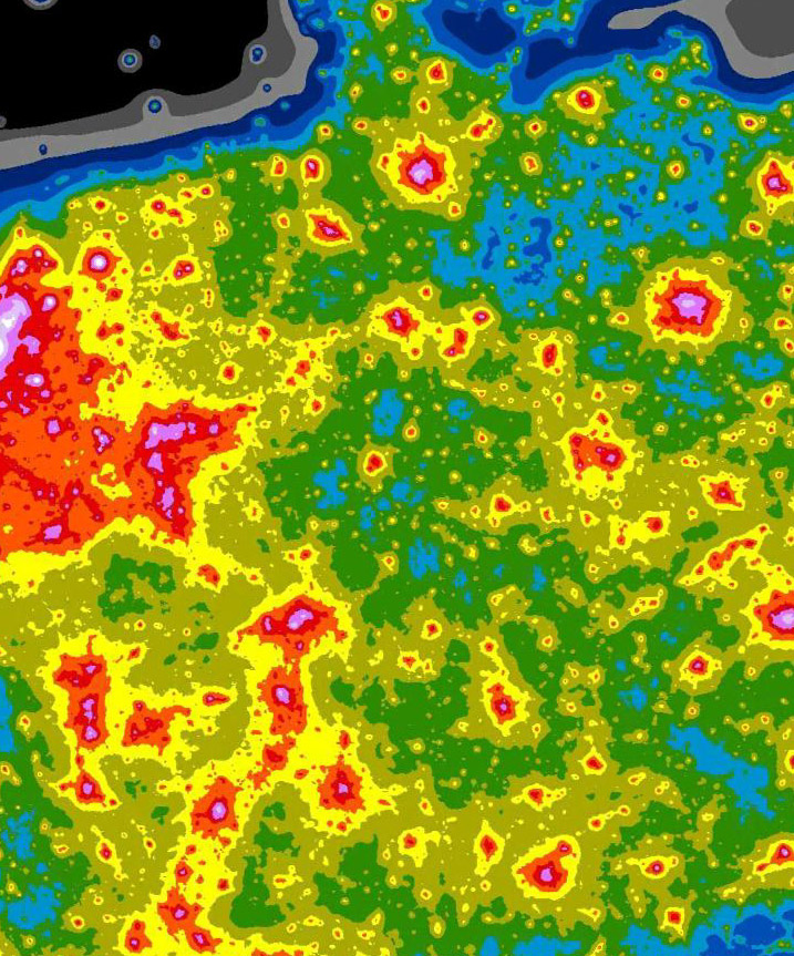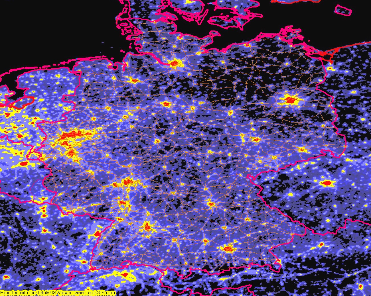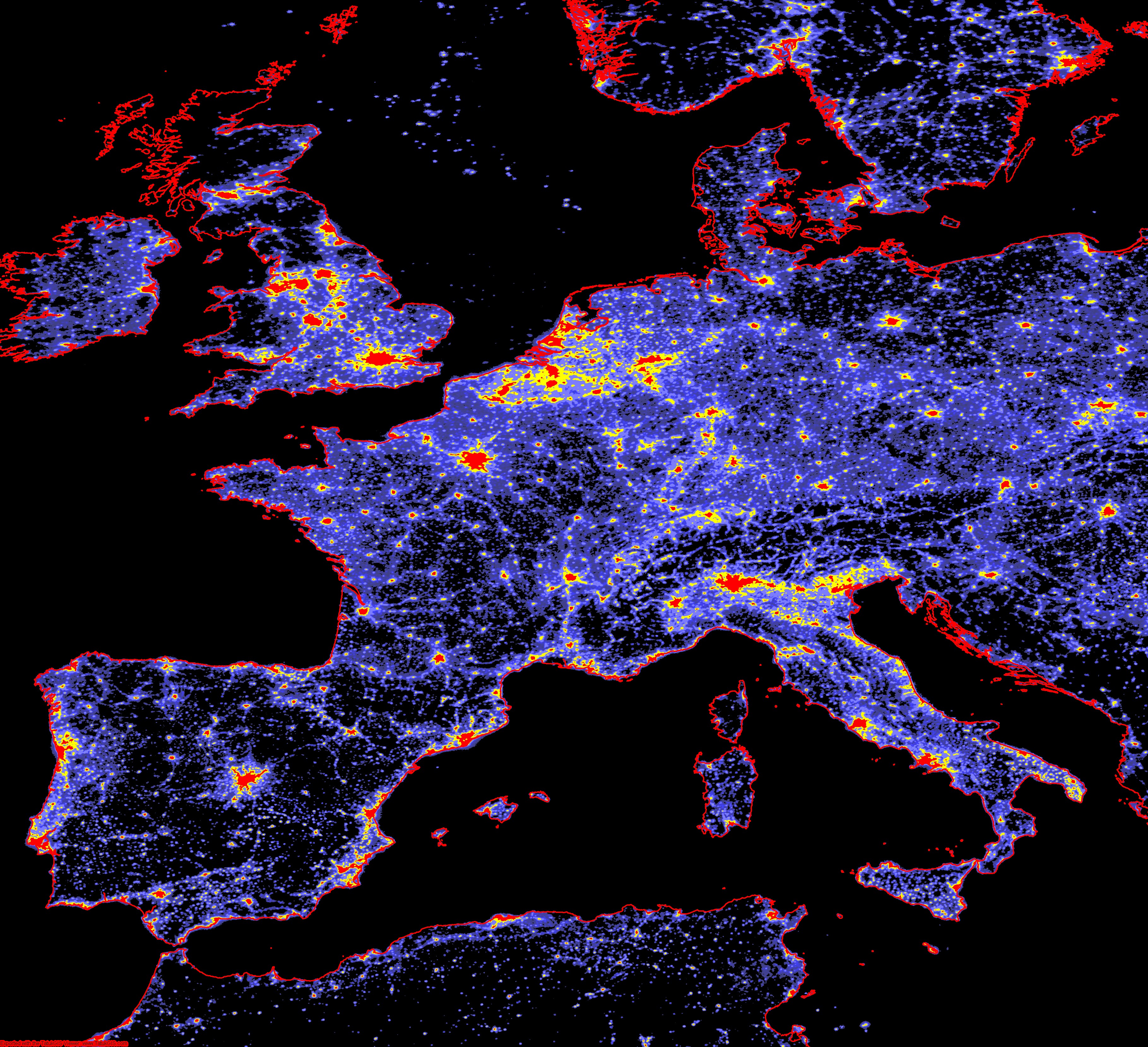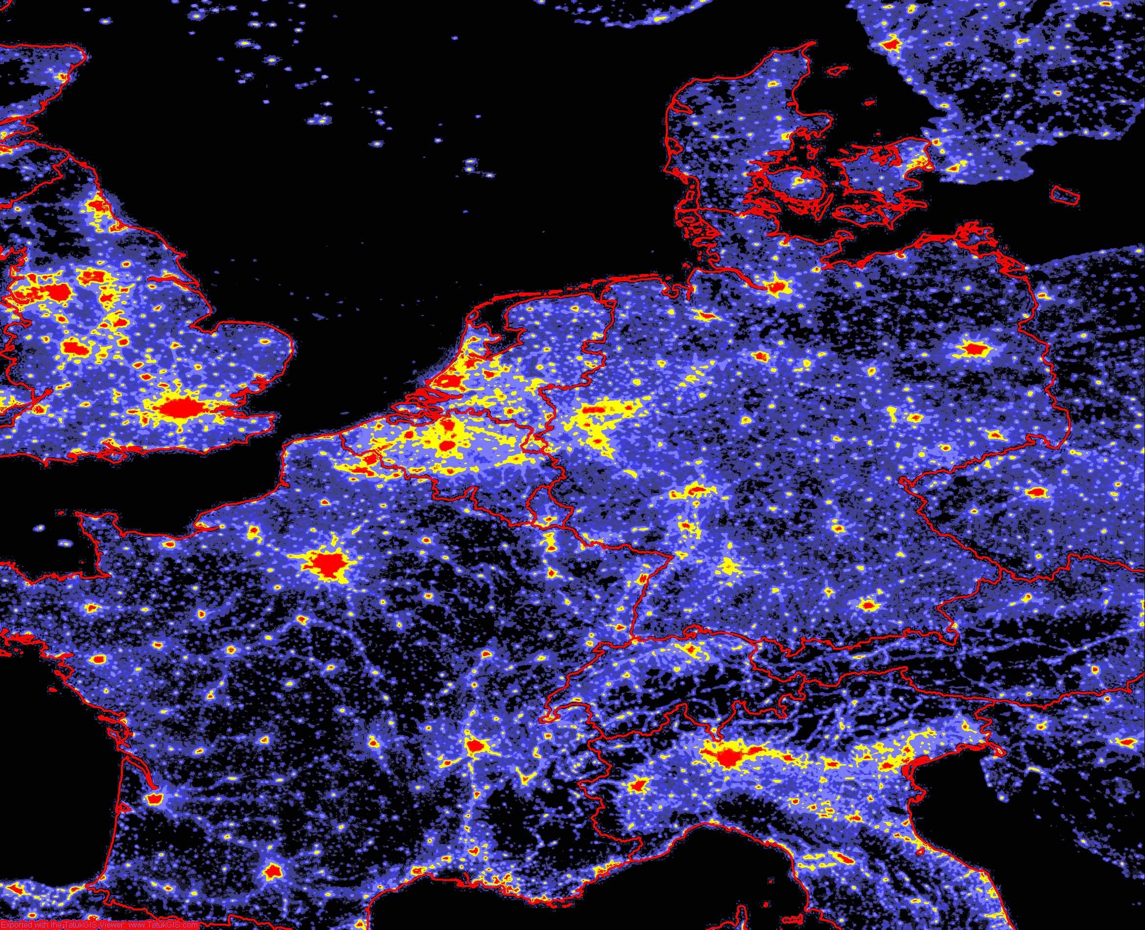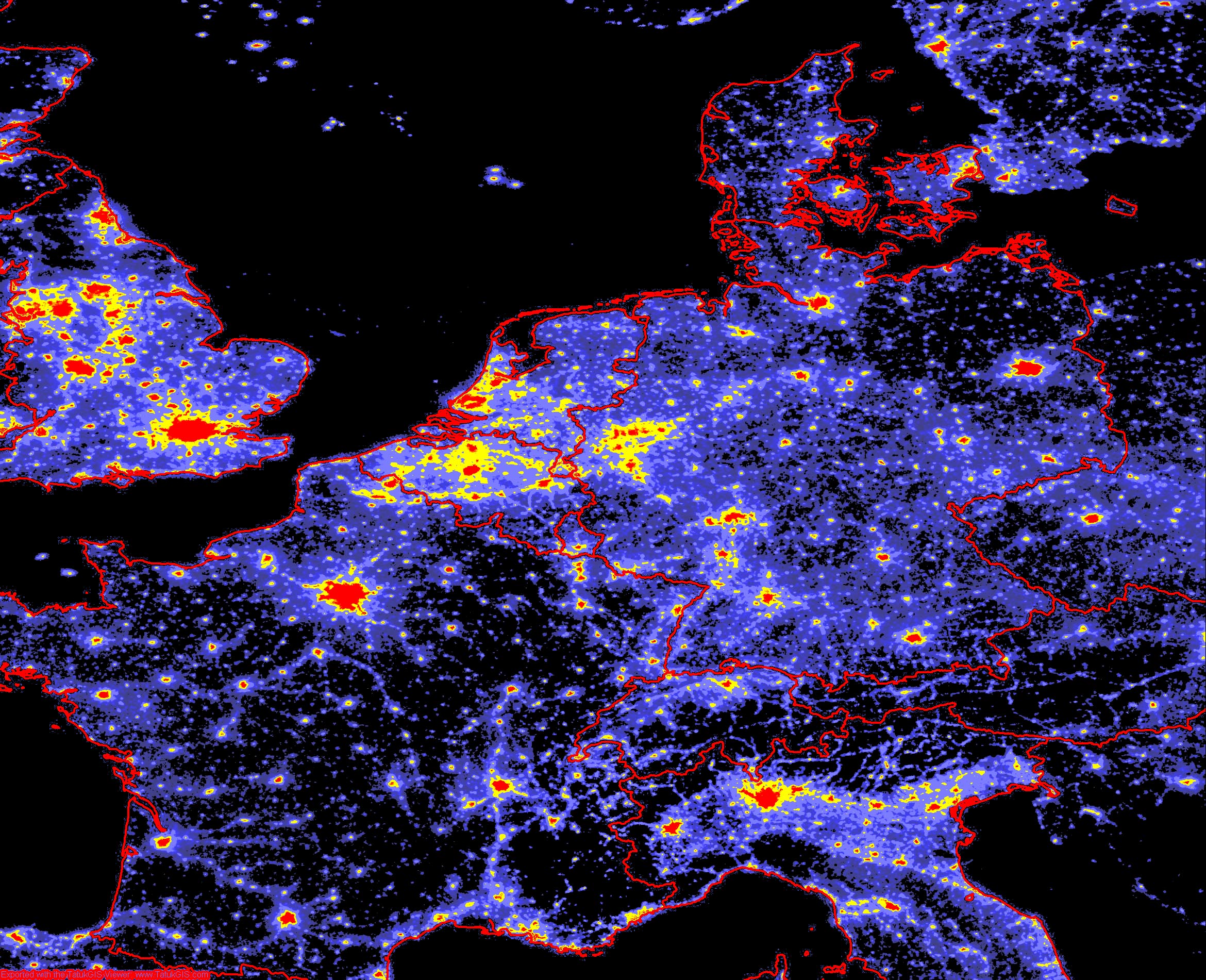 Die Karte von Frederic Tapissier hat zwar eine hohe Auflösung, sie ist aber eigentlich nur ein Abbild der Bevölkerungsdichte. Sie beruht nur auf Kartendaten von Städten und Gewerbegebieten, denen er bestimmte Helligkeiten zugeordnet hat, die er mit Höhendaten kombiniert und verschmiert hat.