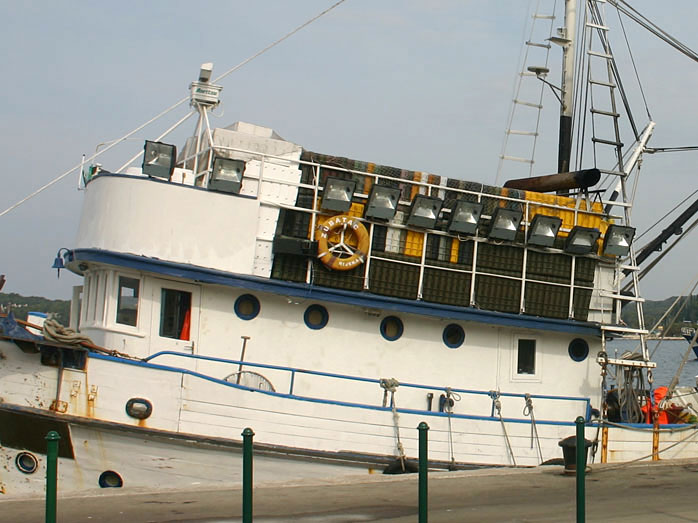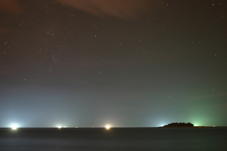 FischereiLichtverschmutzung auf dem Meer produzieren Fischerboote, die mit extrem hellen Scheinwerfern die Fische anlocken. Auf dem Bild rechts sind Fischerboote vor der kroatischen Küste, im Hafen sind die Scheinwerfer zu erkennen (links).