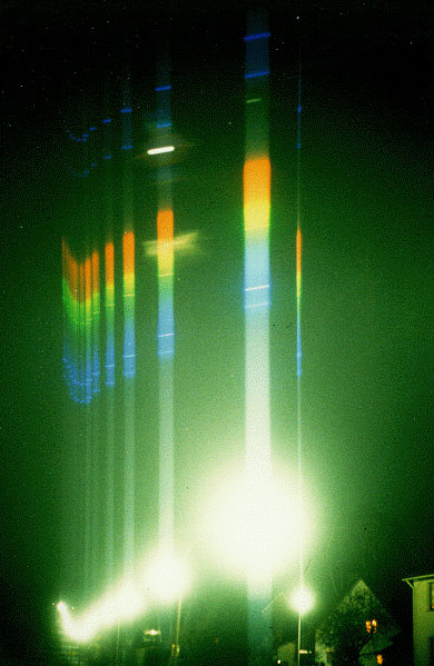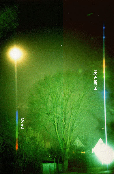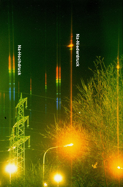 Zerlegt man das Licht der Lampen in seine Regenbogenfarben, so kann man aus diesem Spektrum Hinweise auf die Natur der Lampe ziehen. Für folgende Bilder wurde vor eine Kleinbildkamera ein Transmissionsgitter gesetzt, auf diese Weise sind die Lampen und deren Spektren zu sehen: